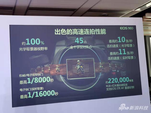 除此之外,佳能EOS 90D支持45点全十字自动对焦,采用22万像素的RGB+红外测光感应器,支持EOS iTR AF面部检测,新增定点自动对焦功能。而快门速度,最高为1/16000秒,最高连拍速度为11张/秒,在光学取景模式下最高支持10张/秒。感光度为100-15600,可扩展到51200。续航方面,支持LP-E6N电池,一块电池可拍摄约1860张照片。